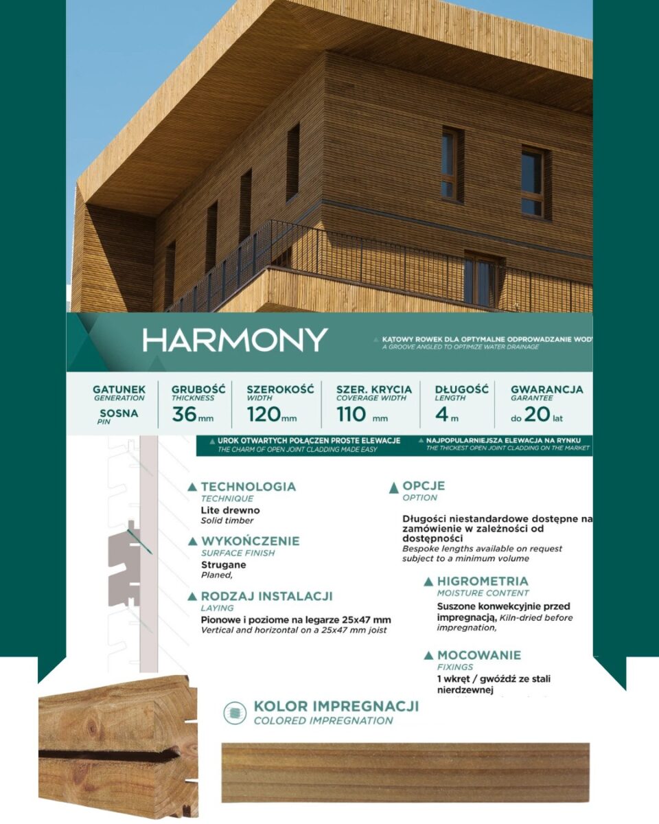 Deska elewacyjna HARMONY impregnowana ciśnieniowo, przeznaczona do wykonywania trwałych i estetycznych elewacji drewnianych w budownictwie mieszkaniowym oraz obiektach użytkowych.