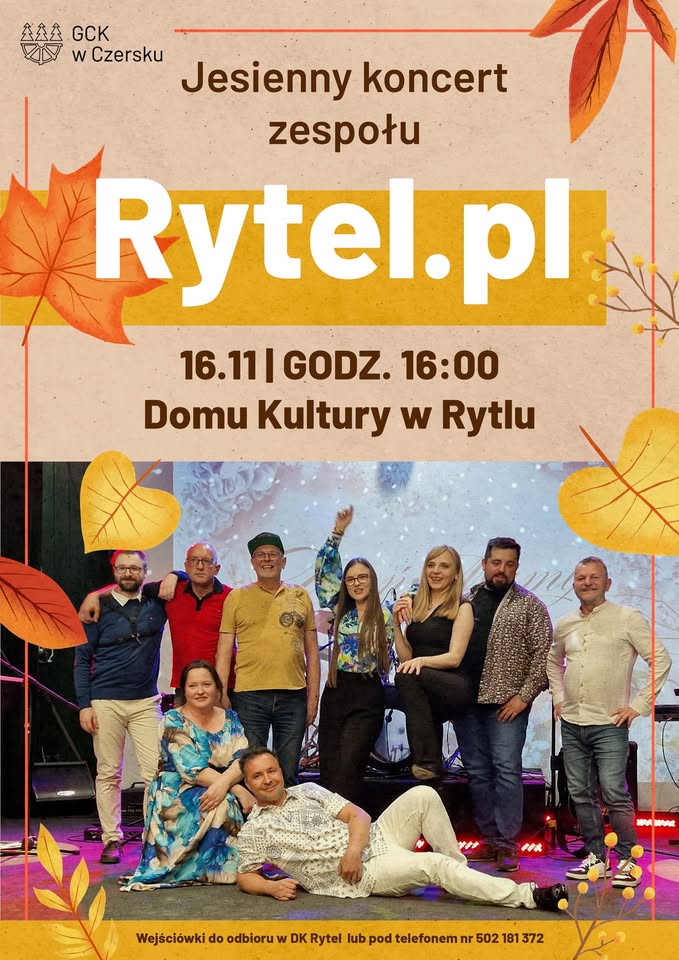 Drodzy, Mili i Kochani! Dom Kultury w Rytlu z radością zaprasza na jesienny koncert zespołu Rytel.pl już 16. listopada o godzinie 16:00! Niech to niedzielne popołudnie stanie się ucztą zarówno dla Waszych uszu, jak i podniebień. Zapraszamy!